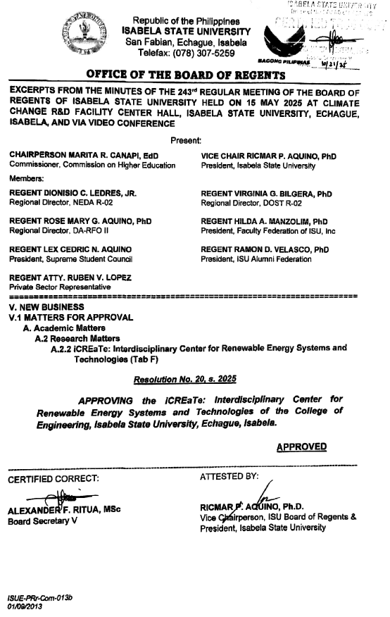 Through iCREaTe, ISU conducts capacity-building programs, workshops, and outreach activities that help local industries, government units, and communities understand the importance of energy conservation and the benefits of transitioning to clean energy. The center also provides energy efficiency assessments and consultancy services to local enterprises, supporting them in reducing energy consumption and adopting renewable energy technologies.